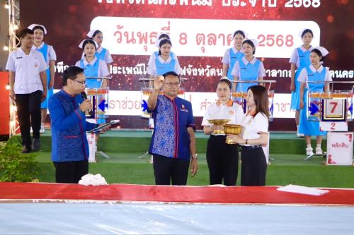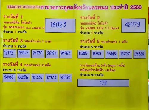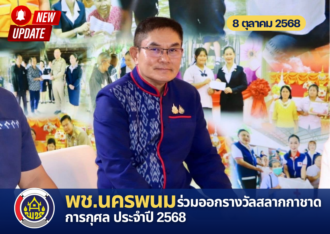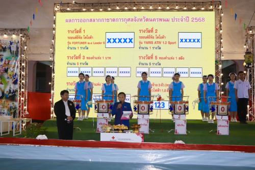 วันที่ 8 ตุลาคม 2568 ว่าที่ร้อยตรีรวยรุ่ง ใครบุตร รองผู้ว่าราชการจังหวัดนครพนม เป็นประธานในการออกรางวัลสลากกาชาดการกุศลจังหวัดนครพนม ประจำปี 2568 พร้อมด้วย นางพาณี พิมพนิตย์ รักษาการนายกเหล่ากาชาดจังหวัดนครพนม นางสุภาลักษณ์ ใครบุตร รองนายกเหล่ากาชาดจังหวัดนครพนม นายนันทวิทย์ นาคแสง ปลัดจังหวัดนครพนม หัวหน้าส่วนราชการ หน่วยงานภาครัฐ ภาคเอกชน และตัวแทนภาคประชาชน ร่วมกันหมุนวงล้อออกรางวัลท่ามกลางบรรยากาศคึกคัก ภายในงานประเพณีไหลเรือไฟและงานกาชาดจังหวัดนครพนม ซึ่งจัดขึ้นระหว่างวันที่ 27 กันยายน – 8 ตุลาคม 2568 ที่เวทีร้านมัจฉากาชาด บริเวณหน้าศาลากลางจังหวัดนครพนม