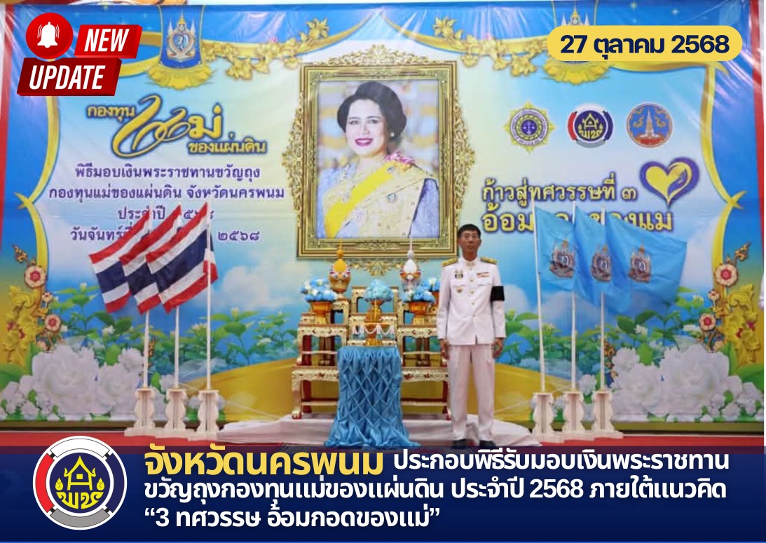 นายวรวิทย์ พิมพนิตย์ รองผู้ว่าราชการจังหวัดนครพนม รักษาราชการแทนผู้ว่าราชการจังหวัดนครพนม เป็นประธานอัญเชิญเงินพระราชทานขวัญถุงกองทุนแม่ของแผ่นดิน ประจำปี 2568 อัญเชิญพระฉายาลักษณ์ สมเด็จพระนางเจ้าสิริกิติ์ พระบรมราชินีนาถ พระบรมราชชนนีพันปีหลวง มามอบให้แก่ตัวแทนหมู่บ้านต้นกล้ากองทุนแม่ของแผ่นดิน จำนวน 17 หมู่บ้าน ในพื้นที่ 12 อำเภอของจังหวัดนครพนม โดยมีนางกนกรัชต์ วงษ์กาฬสินธุ์ พัฒนาการจังหวัดนครพนม กล่าวรายงานการจัดกิจกรรม พร้อมด้วยหัวหน้าส่วนราชการระดับจังหวัด พัฒนาการอำเภอ คณะเจ้าหน้าที่พัฒนาชุมชน และเครือข่ายกองทุนแม่ของแผ่นดินจังหวัดนครพนม เข้าร่วมพิธีกว่า 100 คน โดยประธาน และผู้ร่วมพิธีทุกท่านพร้อมกันยืนสงบนิ่งถวายความอาลัย ด้วยสำนึกในพระมหากรุณาธิคุณเป็นล้นพ้นอันหาที่สุดมิได้